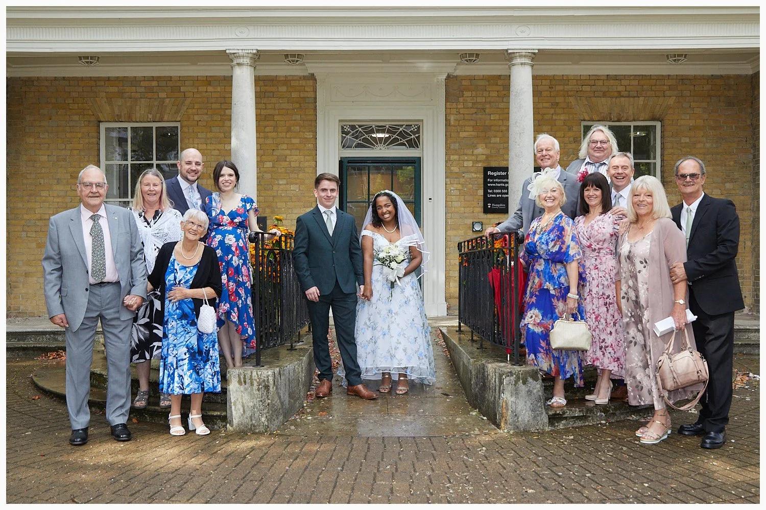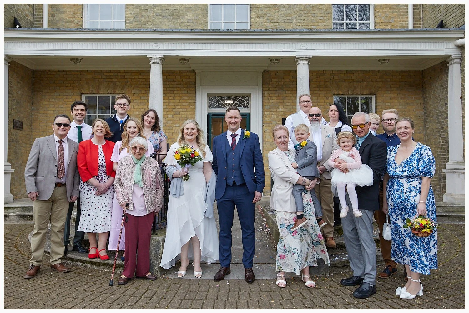 It is great to capture some set-piece and semi-formal photos straight after the ceremony in front of the main entrance to Goldings Basingstoke Registry Office. The steps are ideal for ensuring that everyone can be seen. This photo includes all the guests together with the bride and groom
