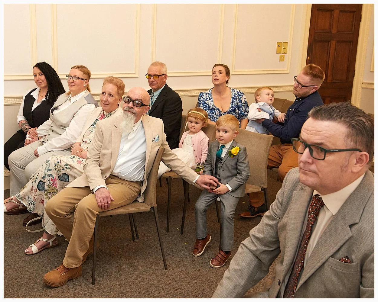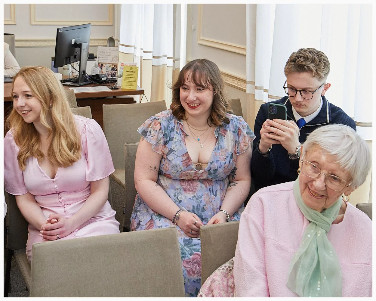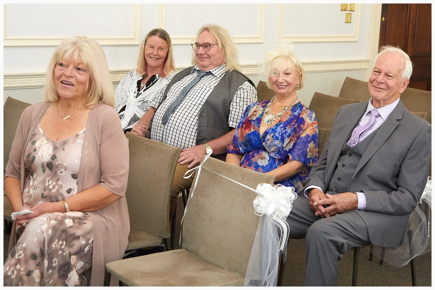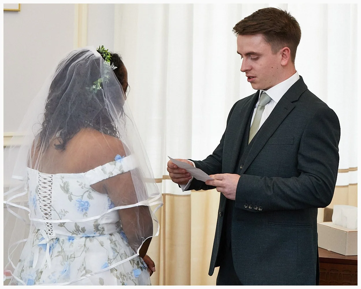 Wedding ceremony in progress at Goldings Basingstoke Registry Office. It can be tricky to photograph the brides face if the photographer is at the front of the room. This is because there is no table between the registrar conducting the ceremony and the bride and groom so the couple are very close to the wall. Plus it is not possible to be located next to the second registrar sitting at their own table. So it is best to move to the back of the room part way through the ceremony having already included the various guests watching the ceremony