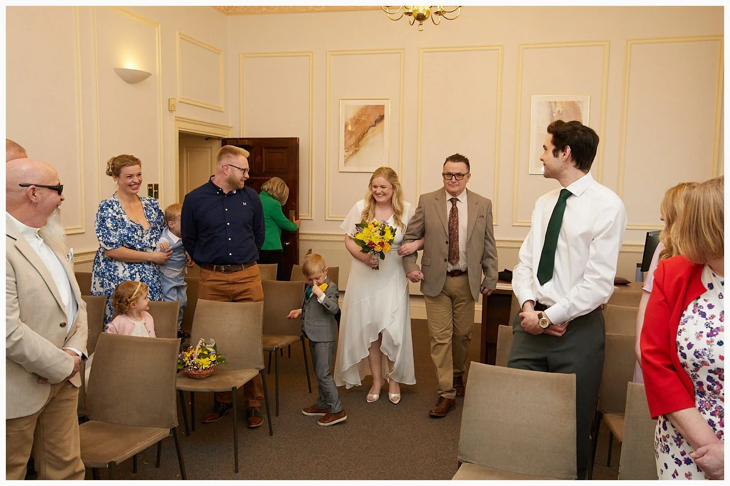 Bride and groom enter the Wellesley Room at Basingstoke Registry Office at the start of their marriage ceremony