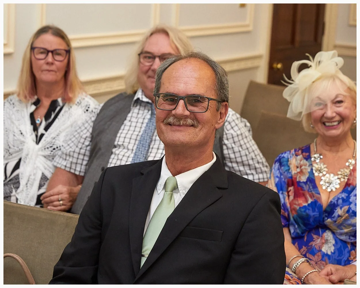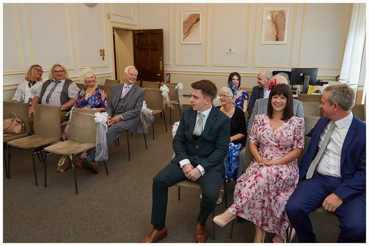 Groom awaits his bride at the start of their wedding ceremony at Goldings Basingstoke Registry Office
