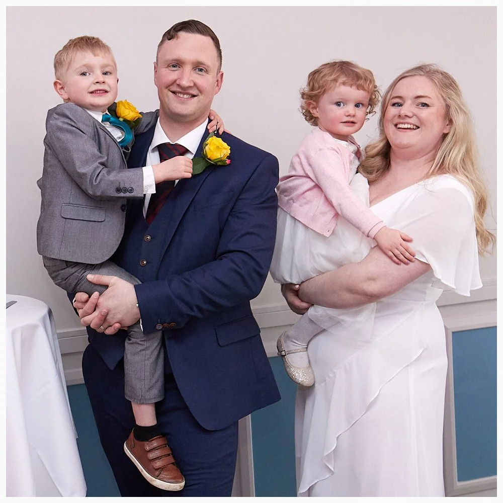 Bride and groom with their lovely kids during the signing of the Marriage Schedule at Goldings, the Basingstoke Registry Office