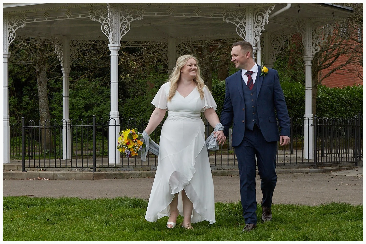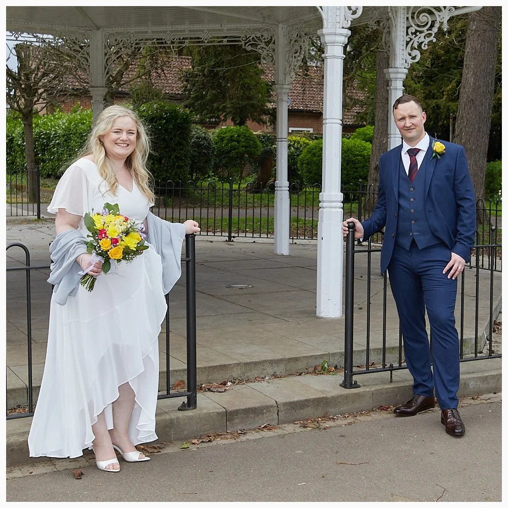 Bride and groom pose for a semi-formal photo at the bandstand in the park after their Basingstoke wedding