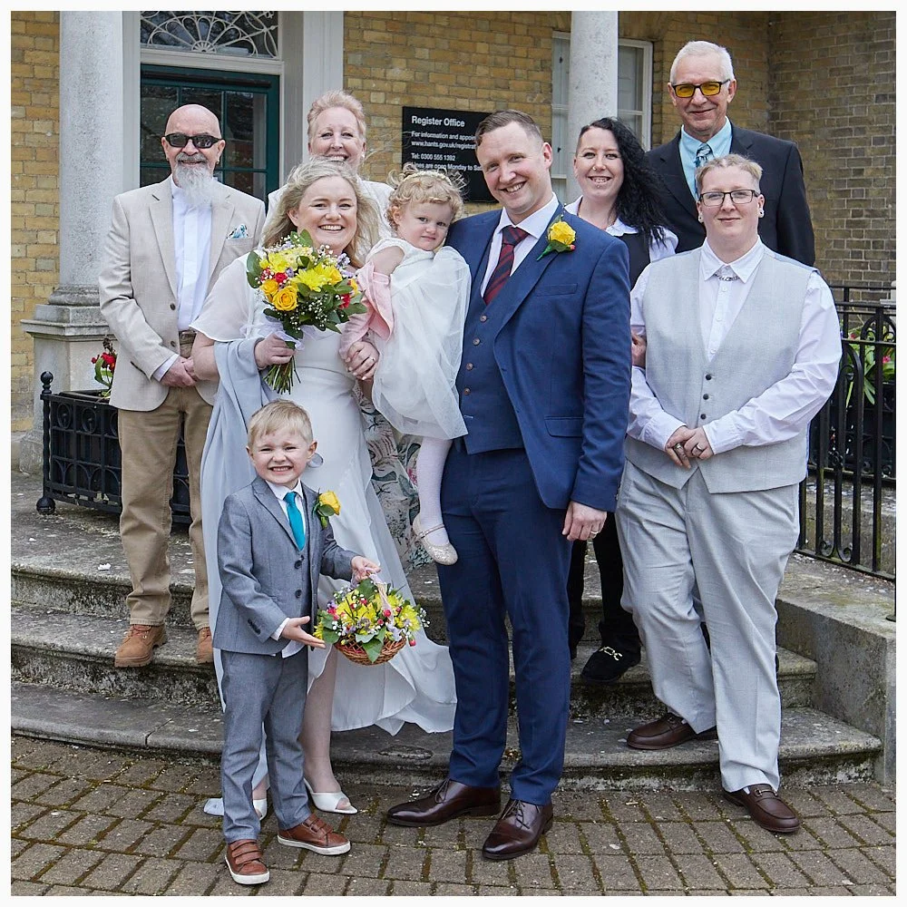 The steps outside the registry office are an ideal position to ensure that all the participants in group photos can be seen
