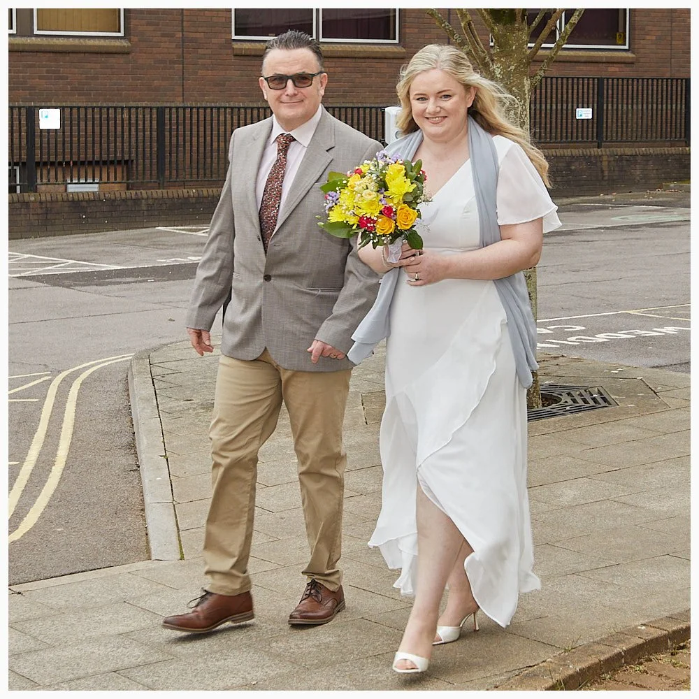 Bride arrives with her dad for her wedding ceremony at Goldings Basingstoke Registry Office