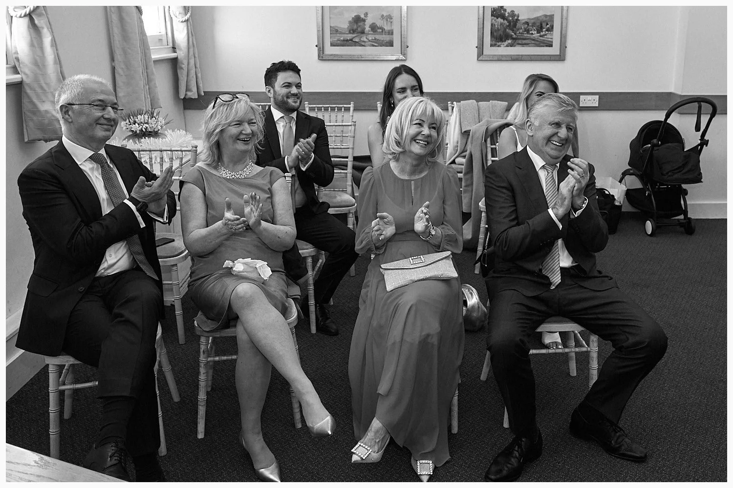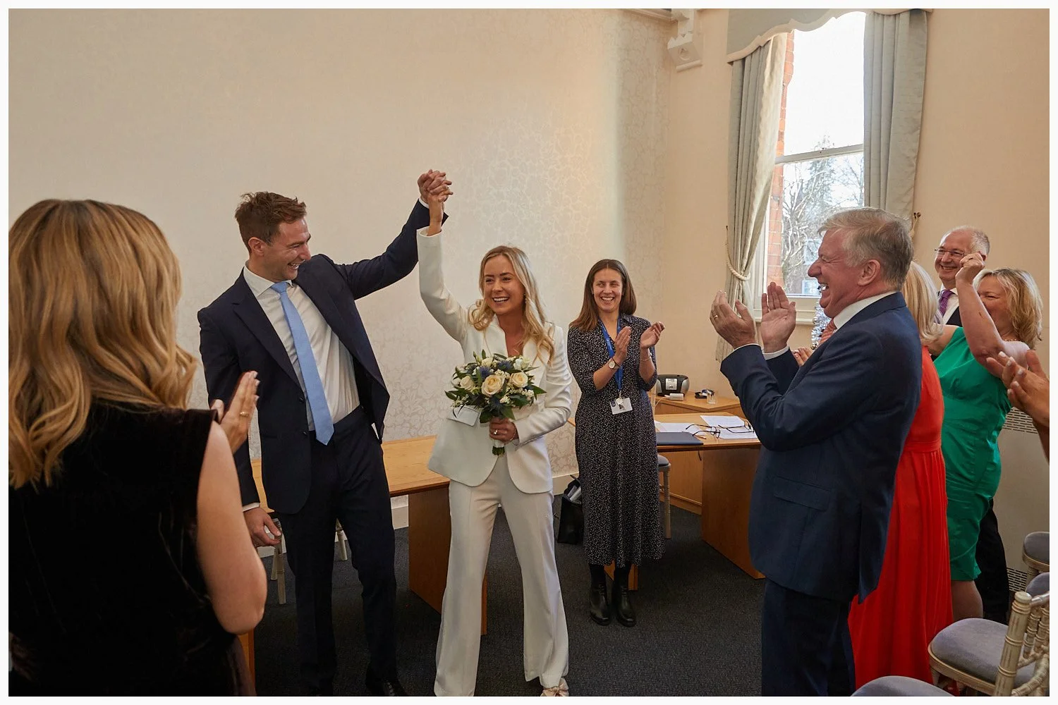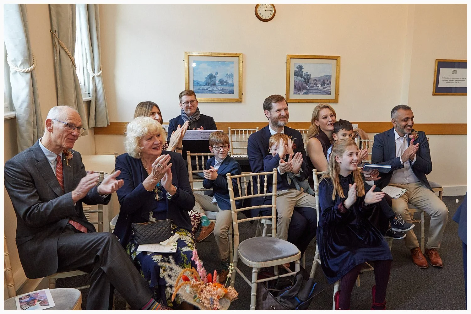 Guests clap to support the bride and groom on their wedding day at Beaconsfield Registry Office