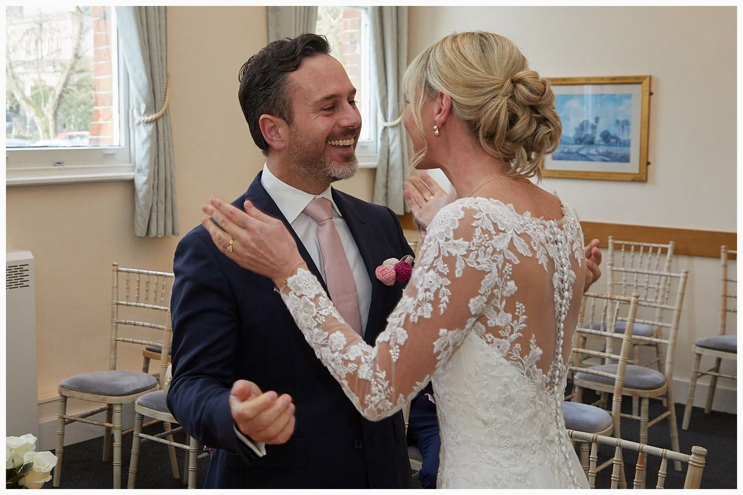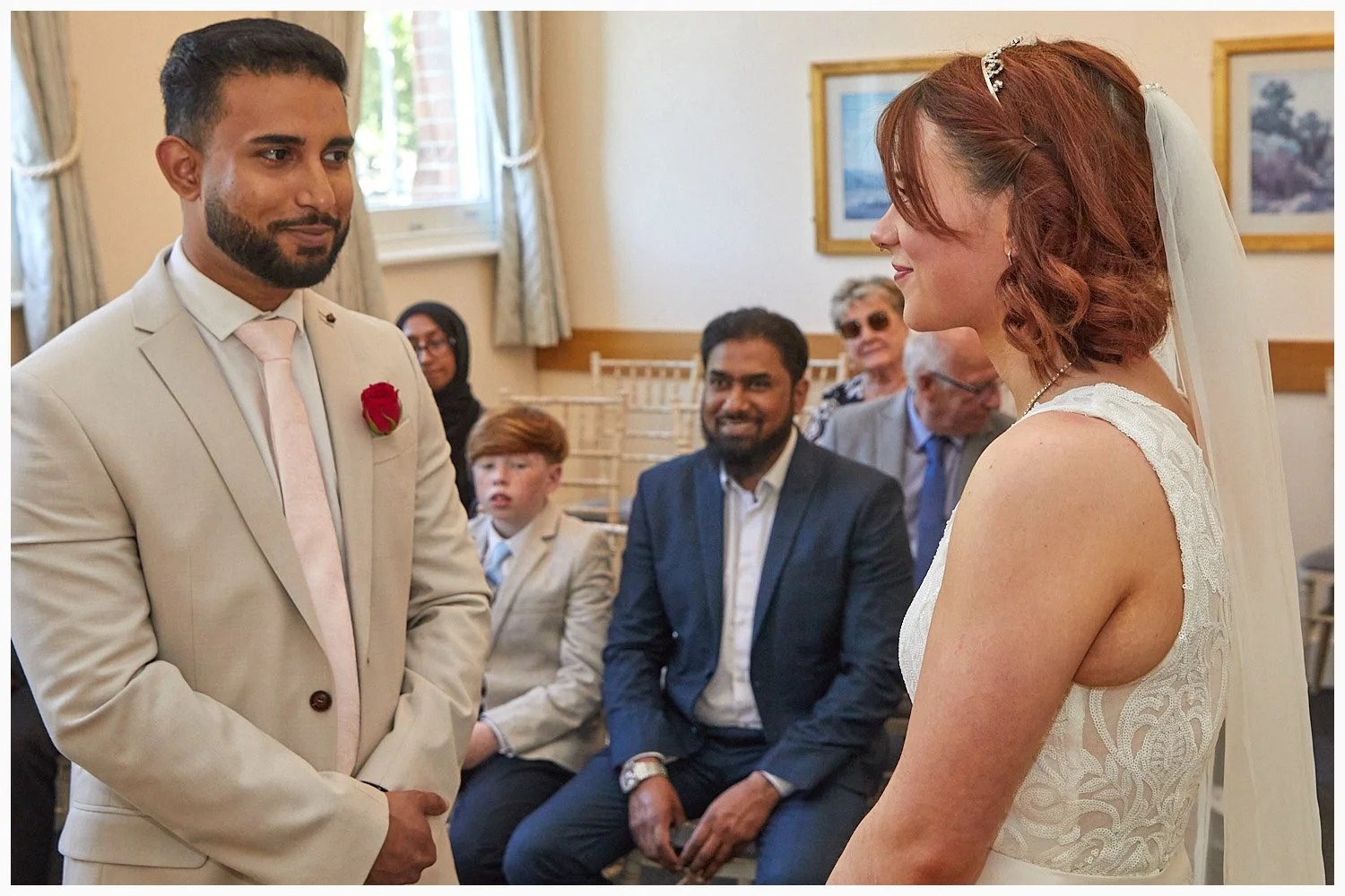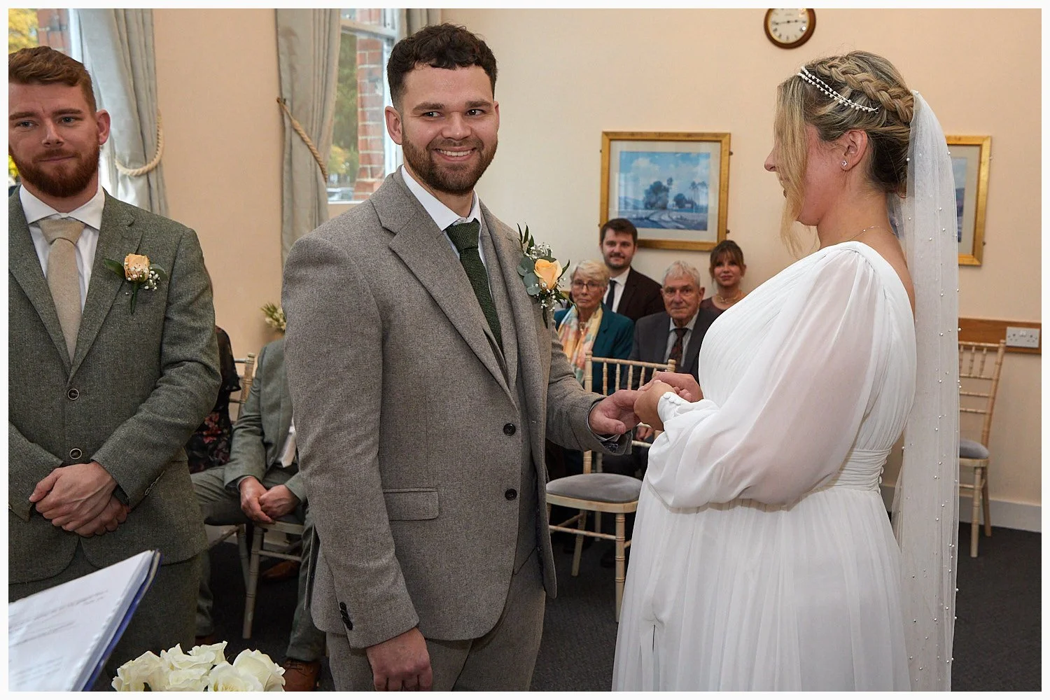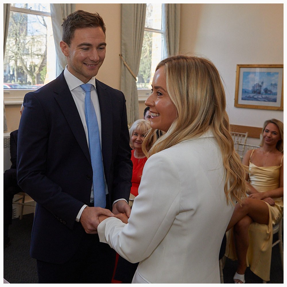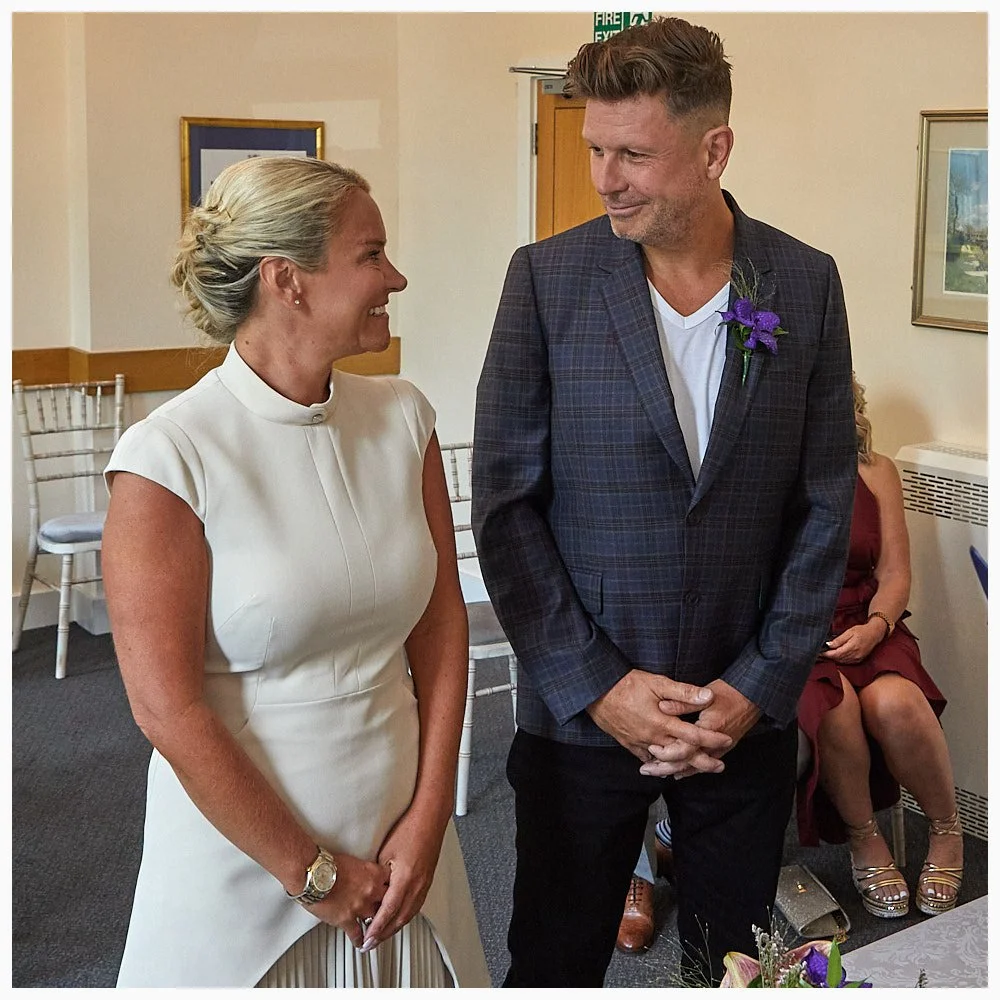 Groom enjoys his first look at his bride as the marriage ceremony commences at Beaconsfield Registry Office