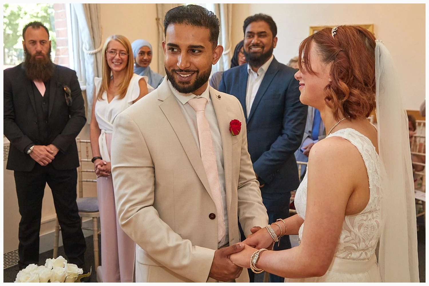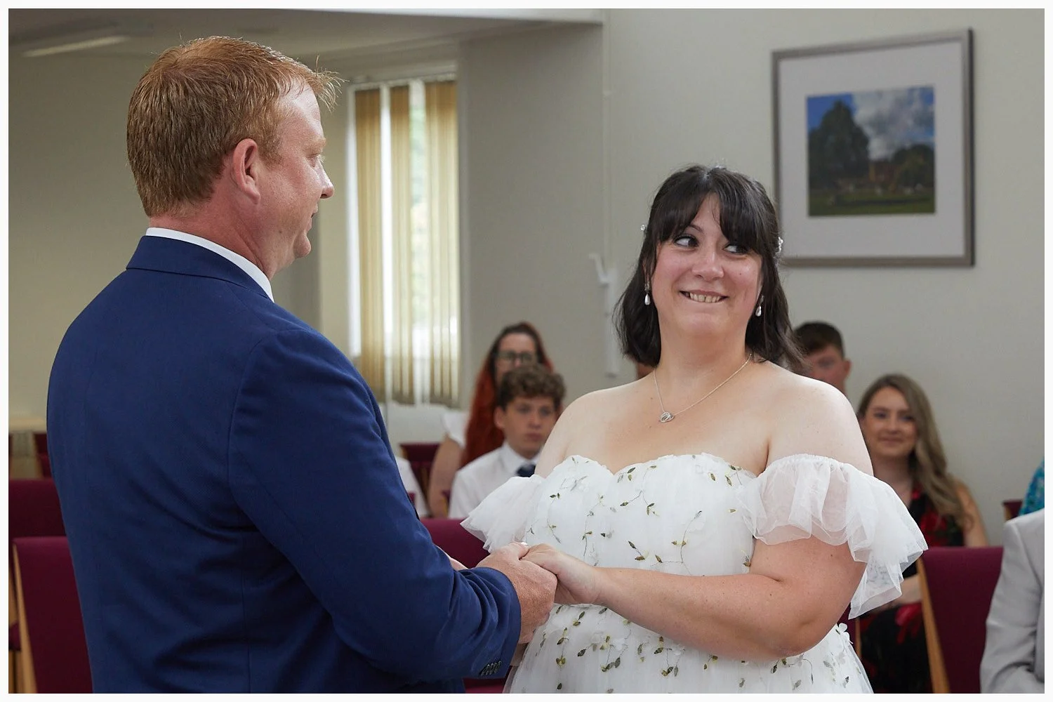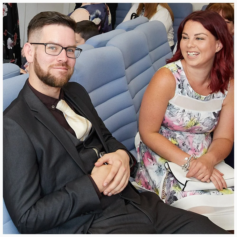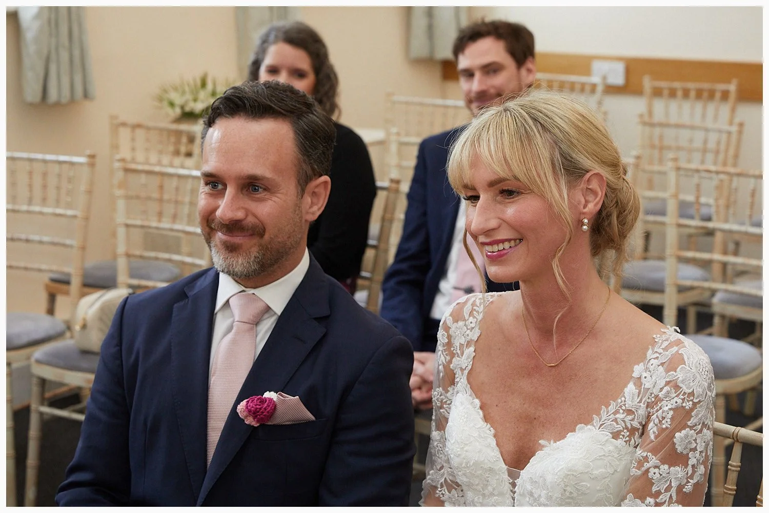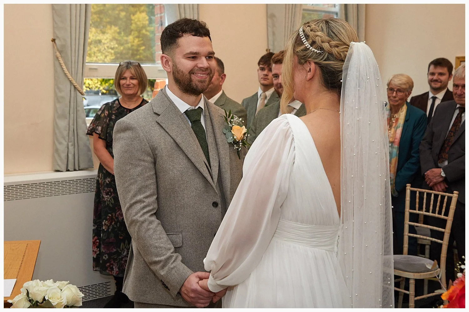 Groom enjoys his first look at his bride as the marriage ceremony commences at Beaconsfield Registry Office