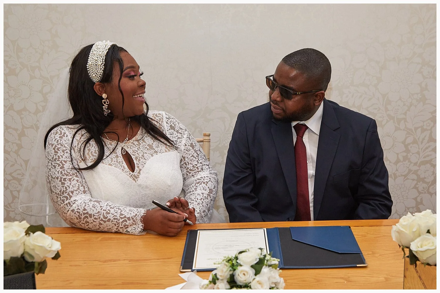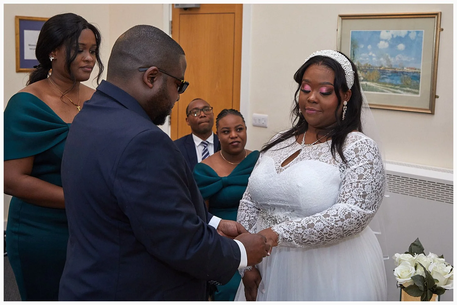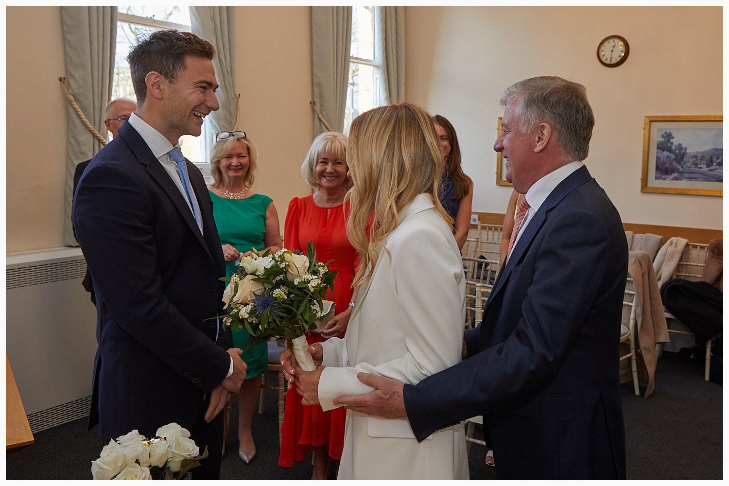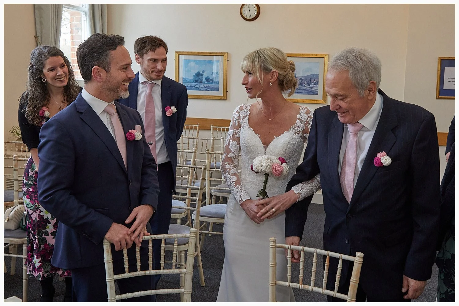 Groom enjoys his first look at his bride as the marriage ceremony commences at Beaconsfield Registry Office