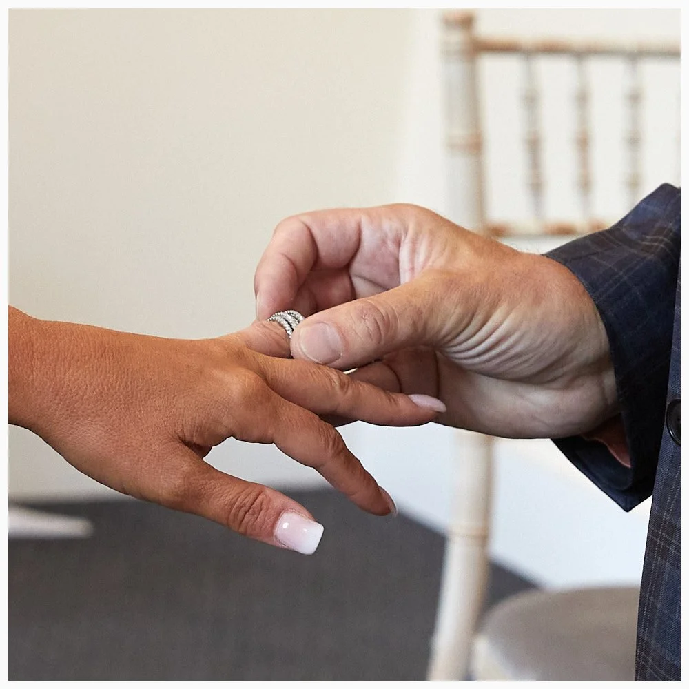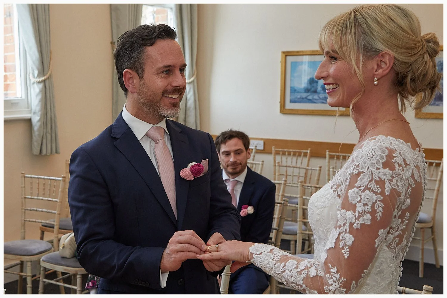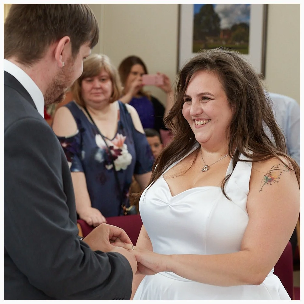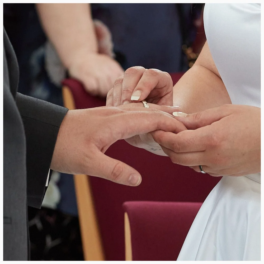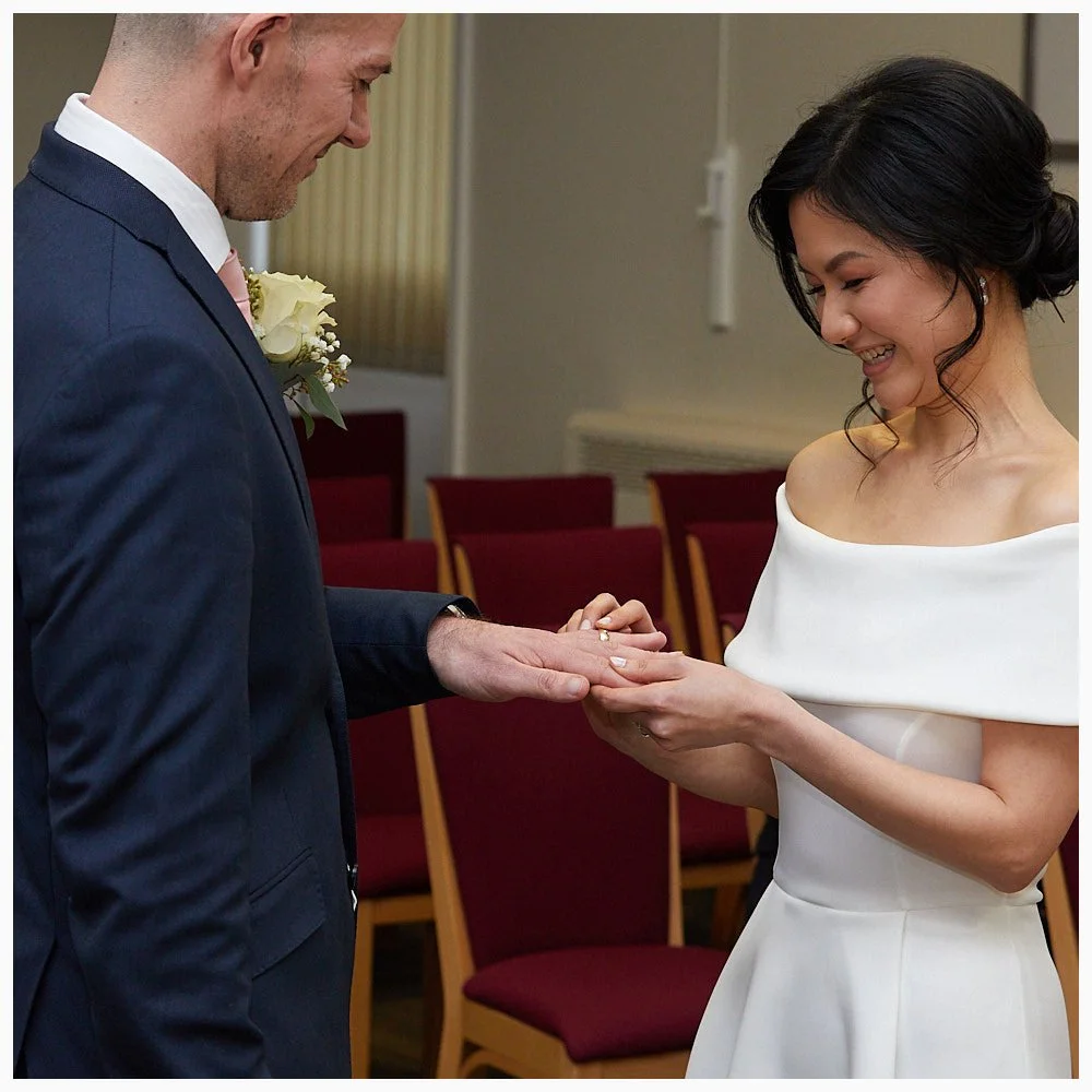 Bride and groom exchange rings during their marriage ceremony at Beaconsfield Registry Office
