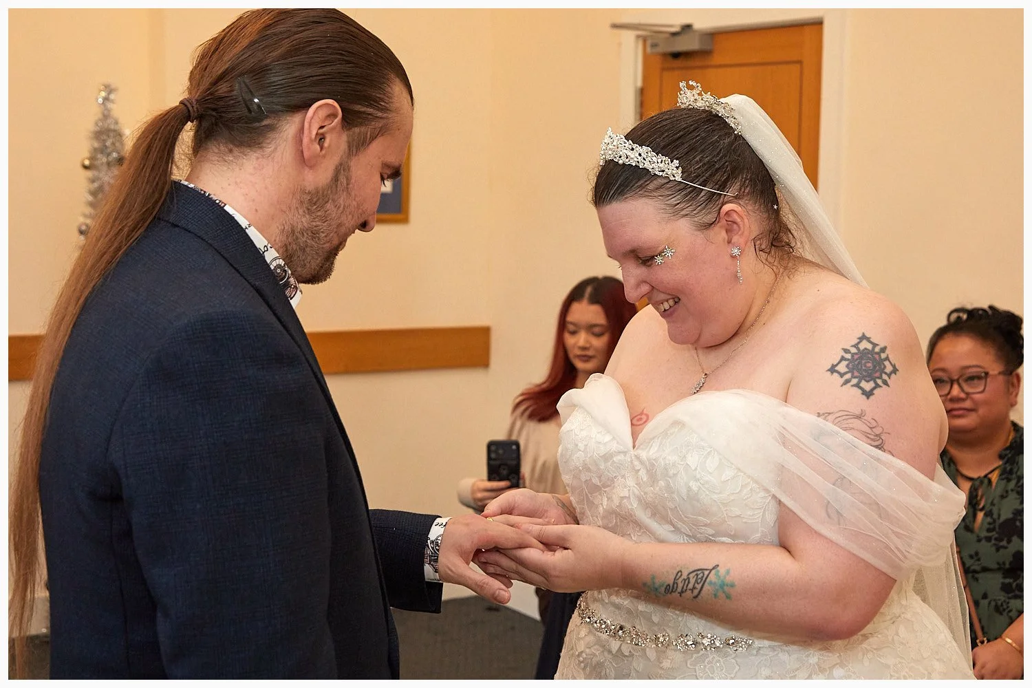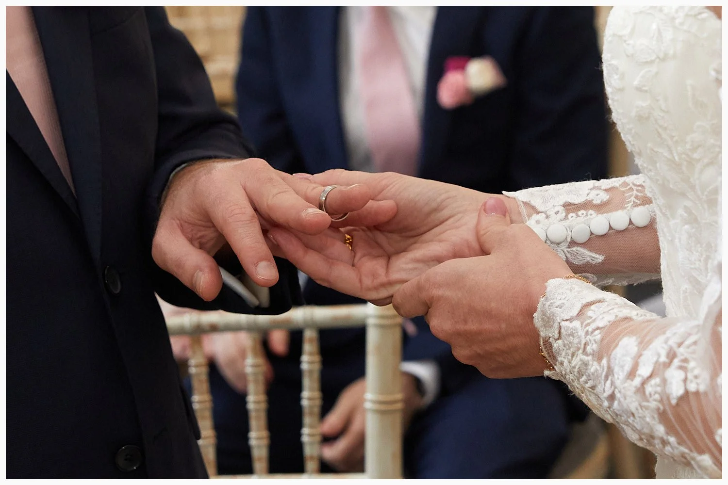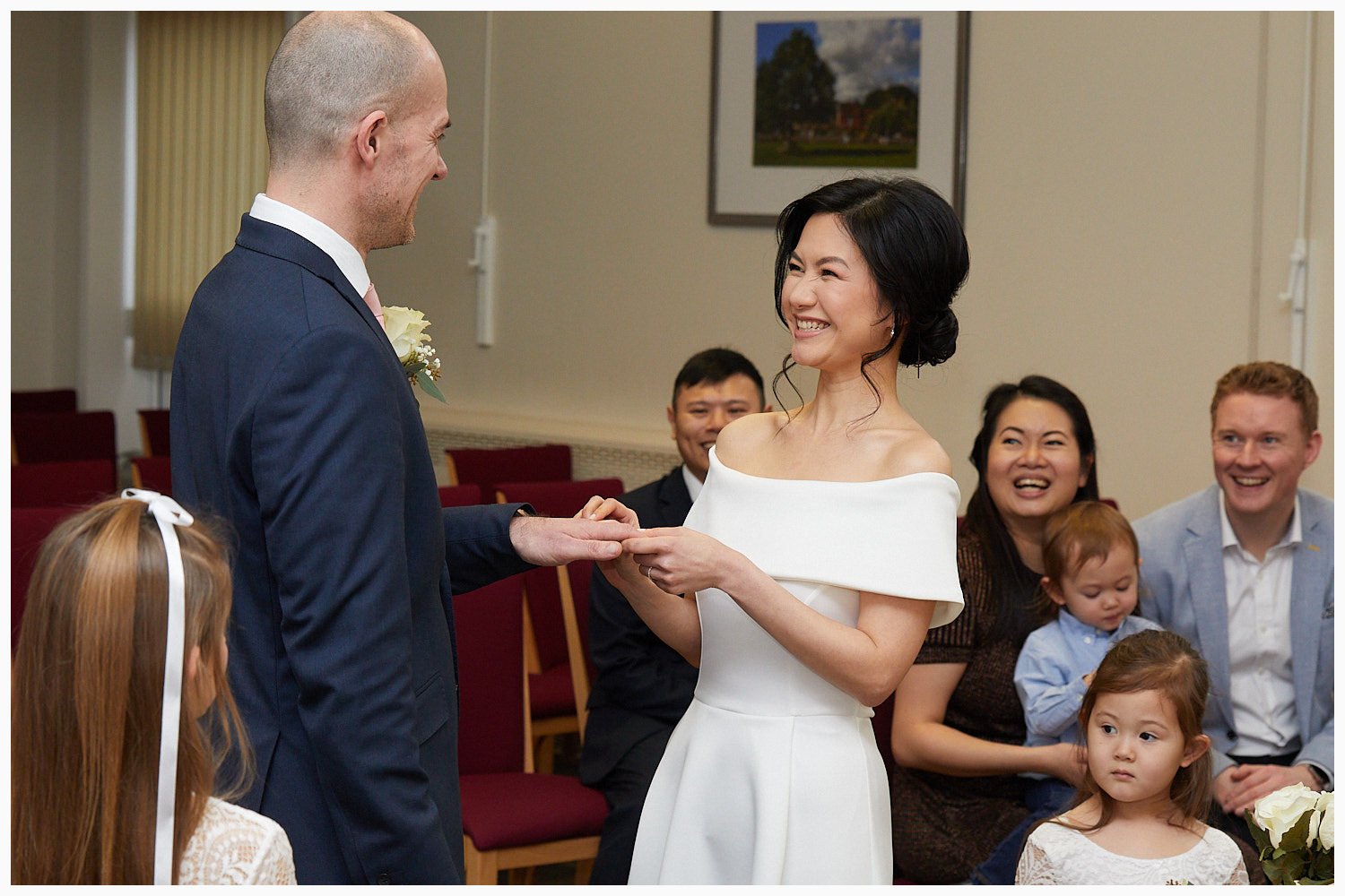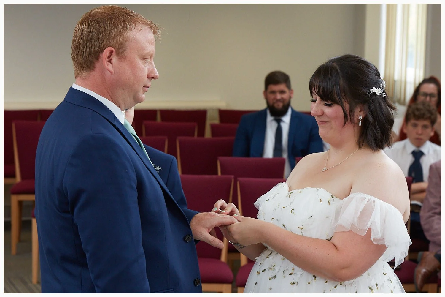 Bride and groom exchange rings during their marriage ceremony at Beaconsfield Registry Office