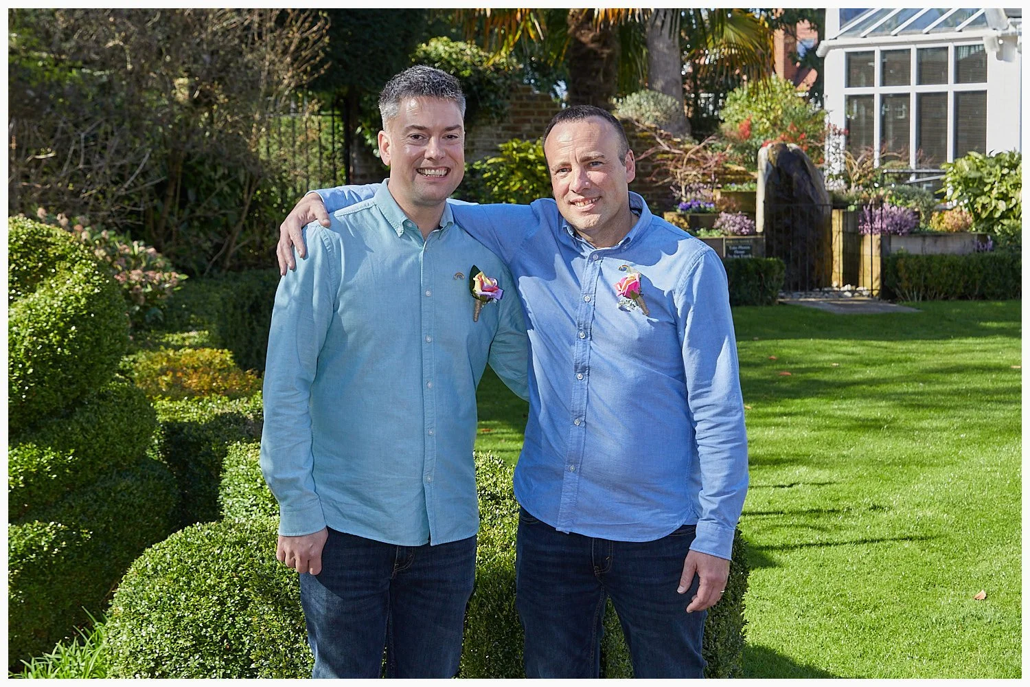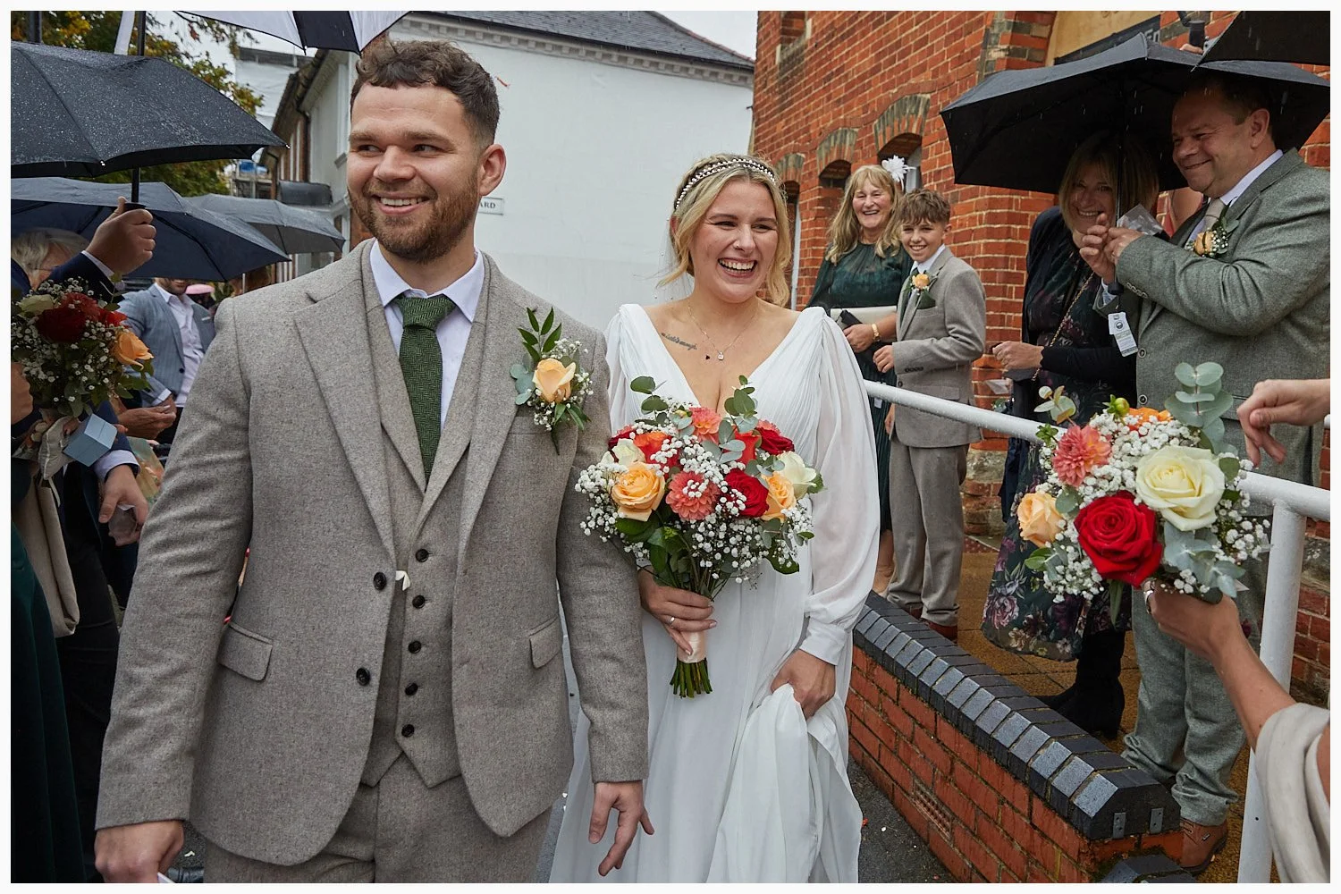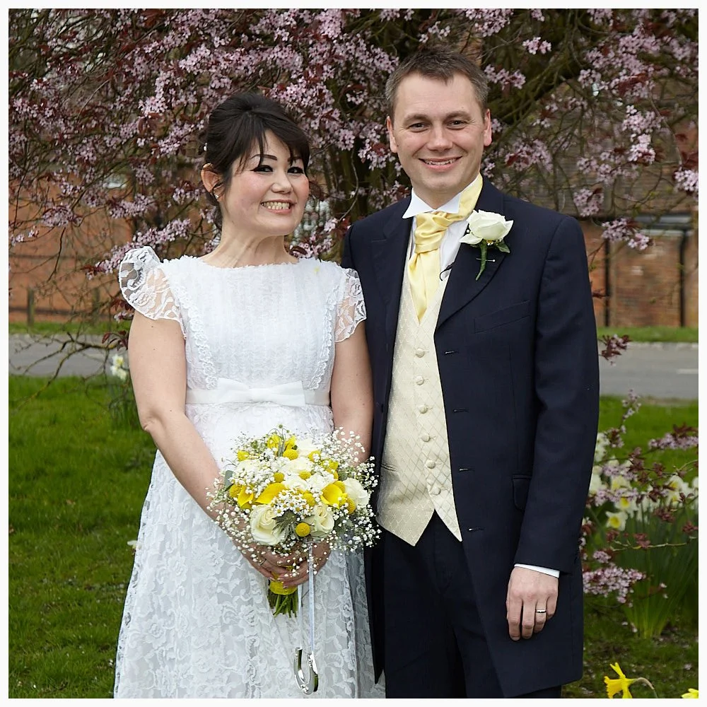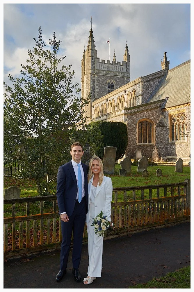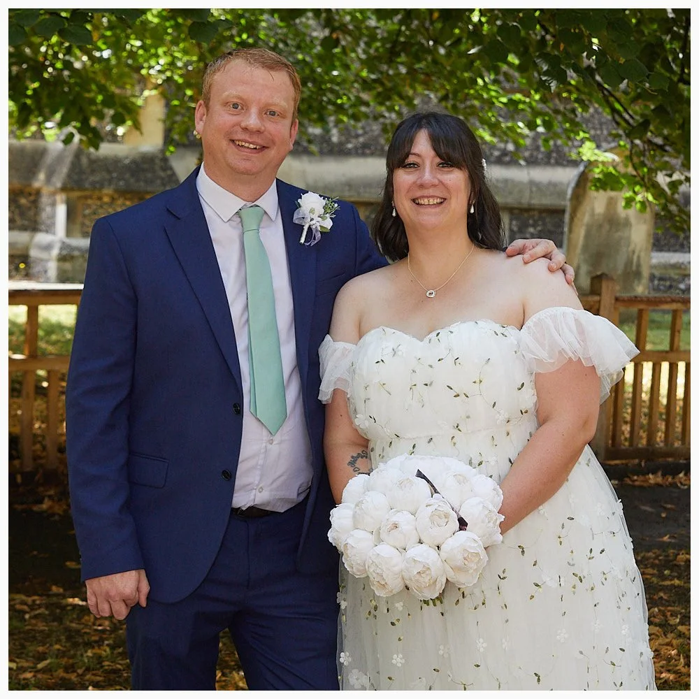 A semi-formal photo of the bride and groom with the churchyard in the background after the ceremony at Beaconsfield Registry Office