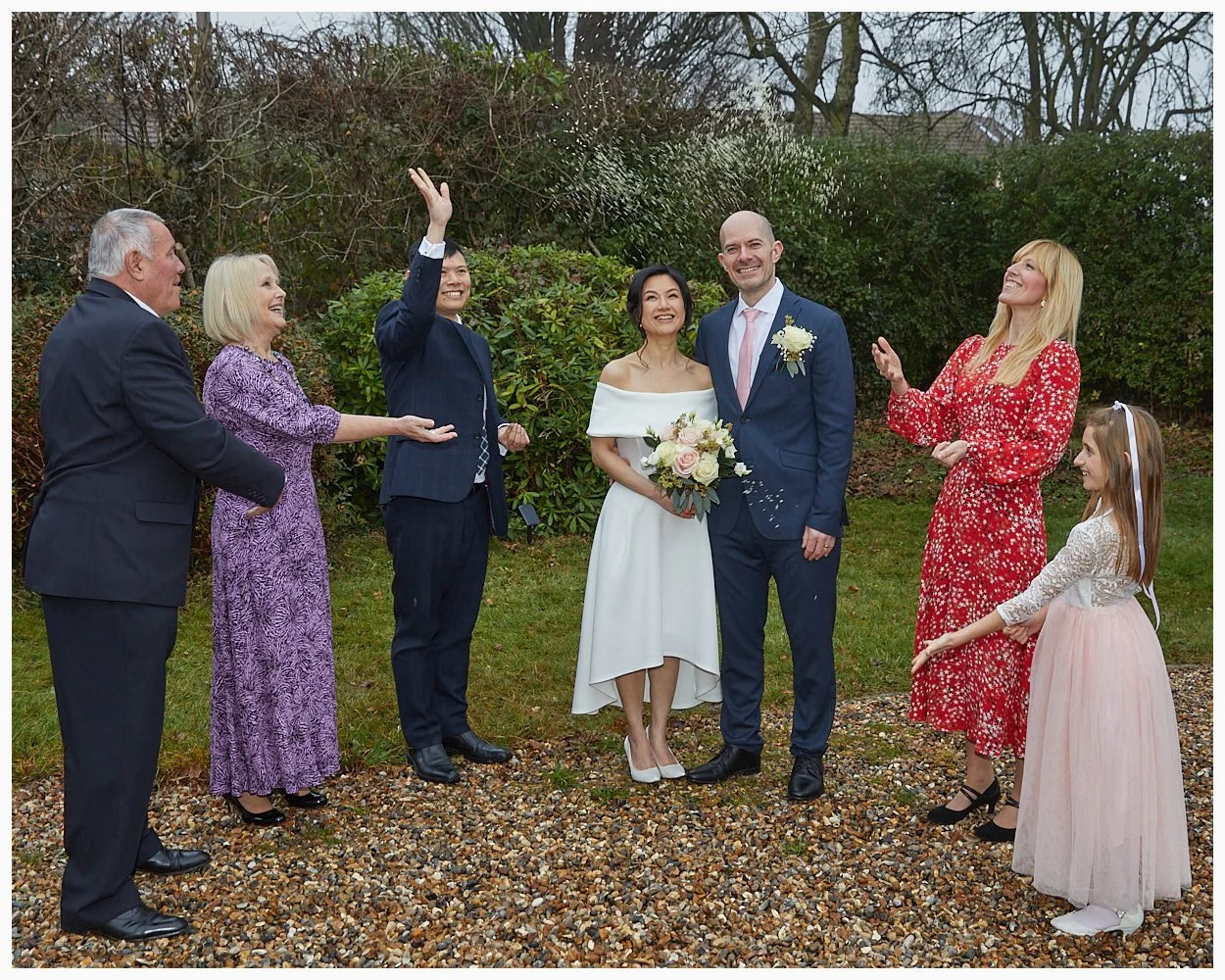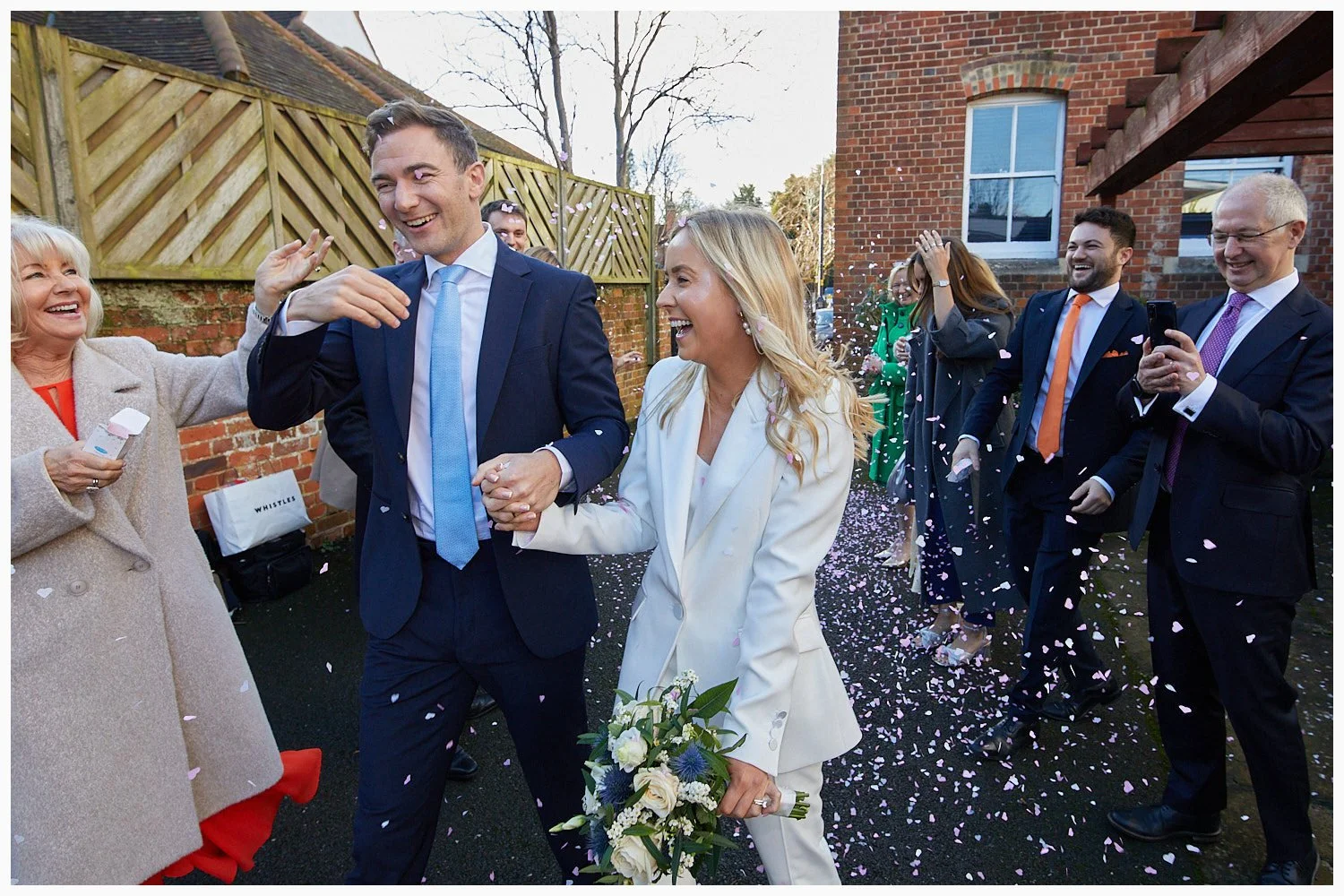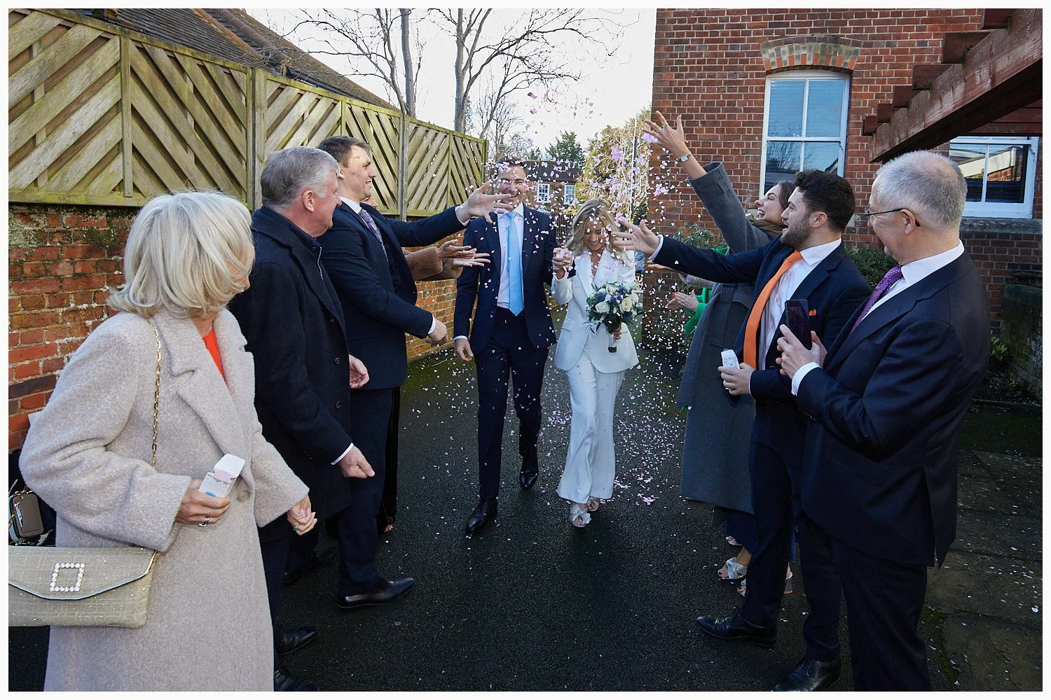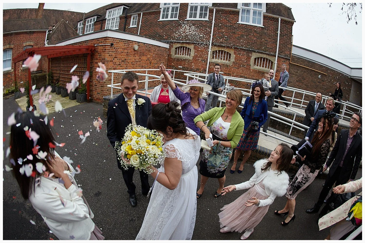 Guests shower confetti over the bride and groom after their wedding ceremony at Beaconsfield Registry Office