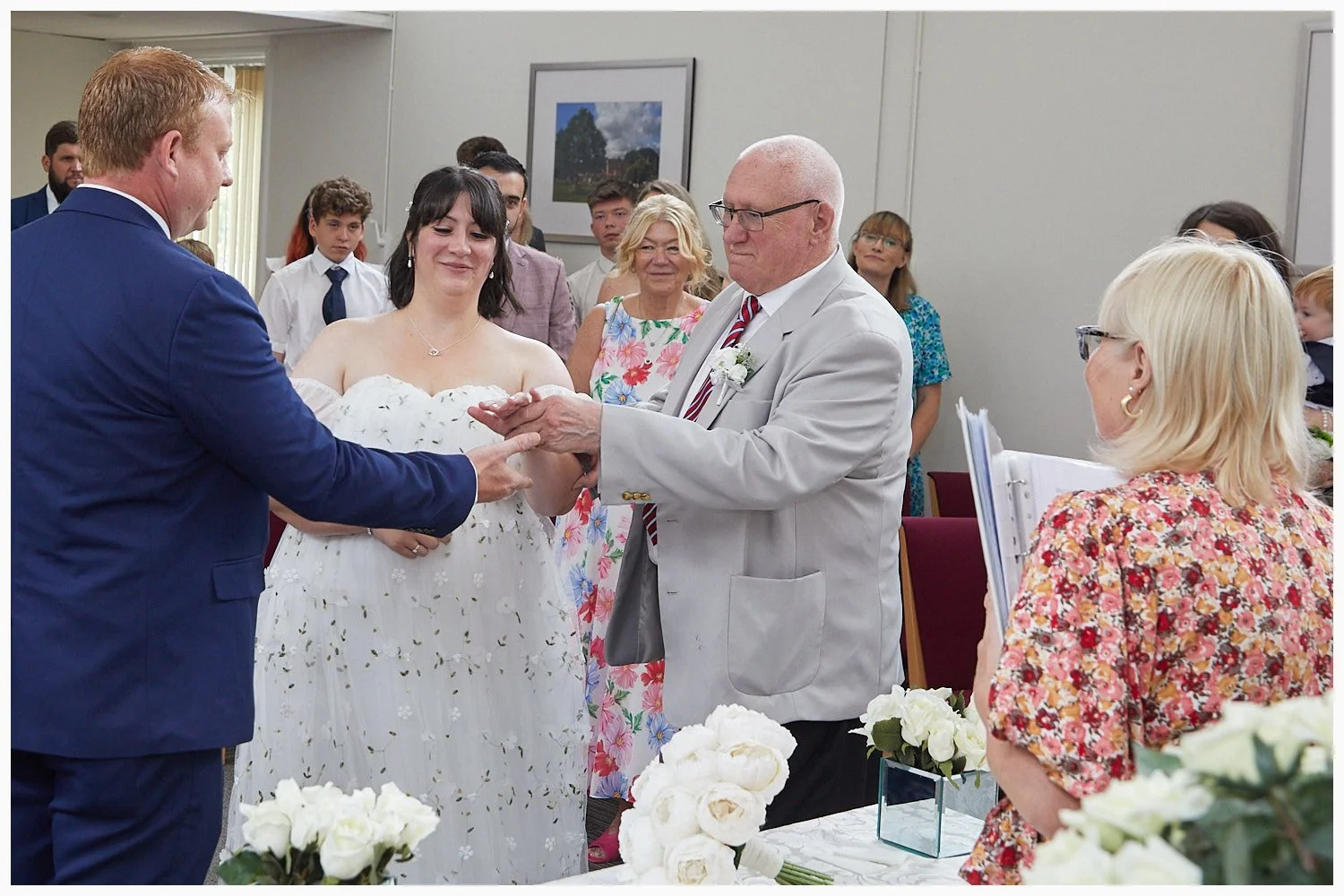 Father of the bride gives the brides hand away to her groom at the start of the wedding ceremony at Beaconsfield Registry Office