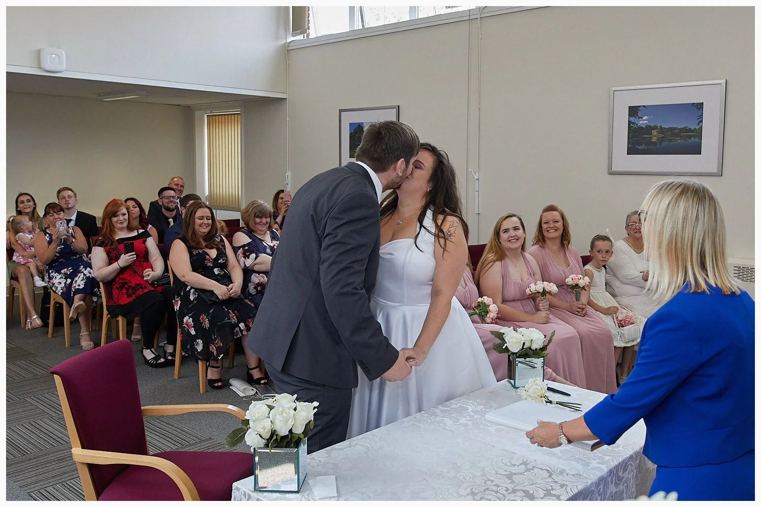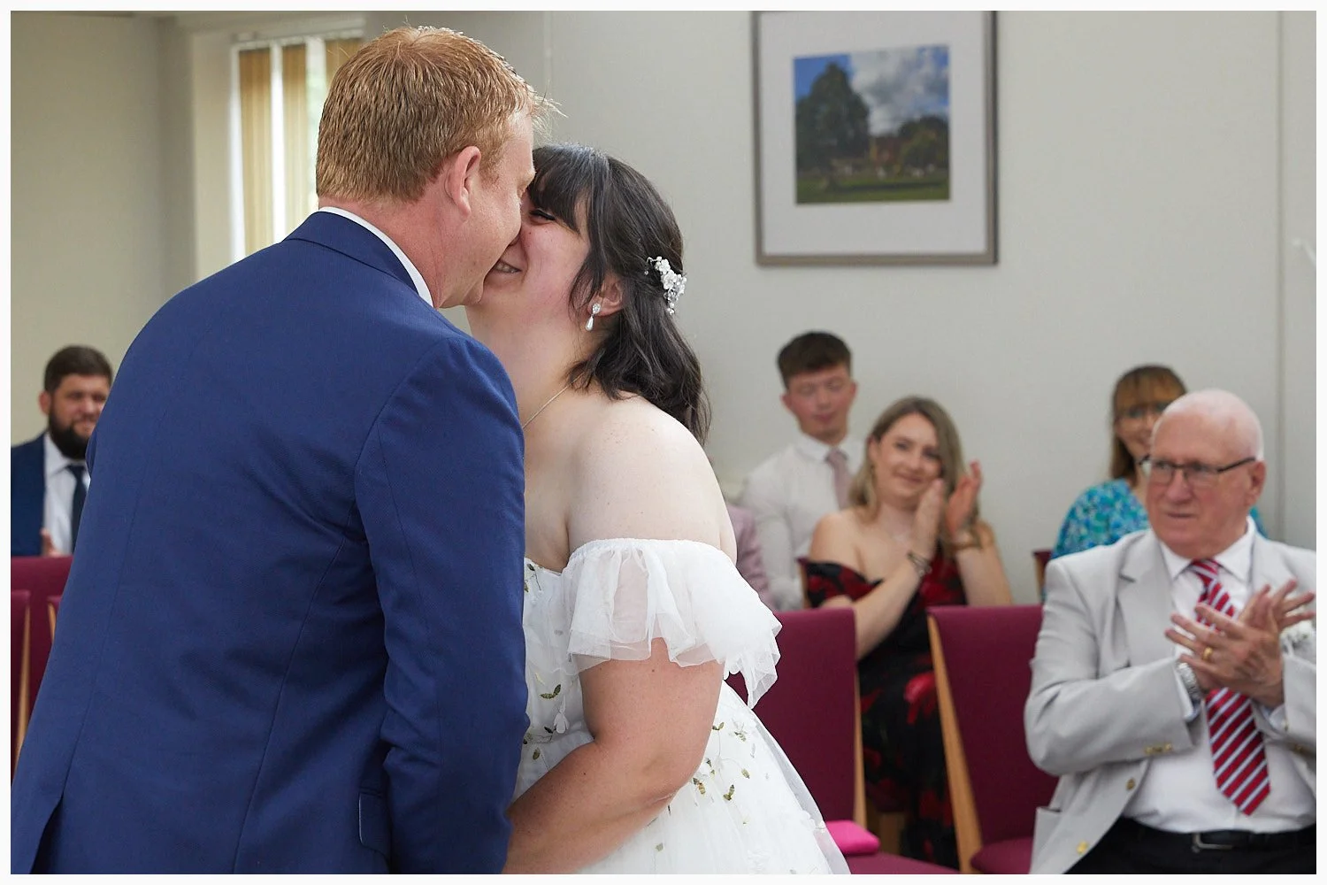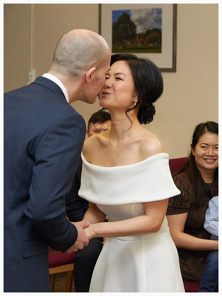 Bride and groom make their first kiss as the wedding ceremony concludes at Beaconsfield Registry Office