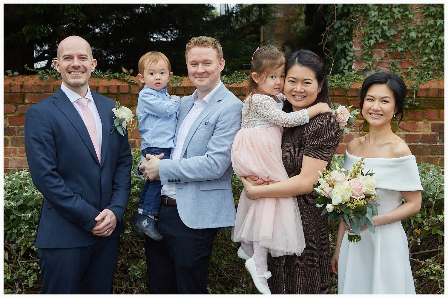 The terrace immediately outside Midsomer Court Beaconsfield Registry Office is a great location for some group and portrait photos. This photo includes the brides sister, her husband and their two children with the bride and groom
