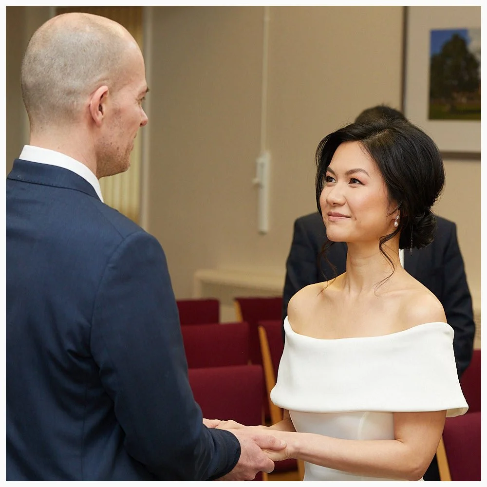 Bride and groom make their vows during the wedding ceremony at Beaconsfield Registry Office