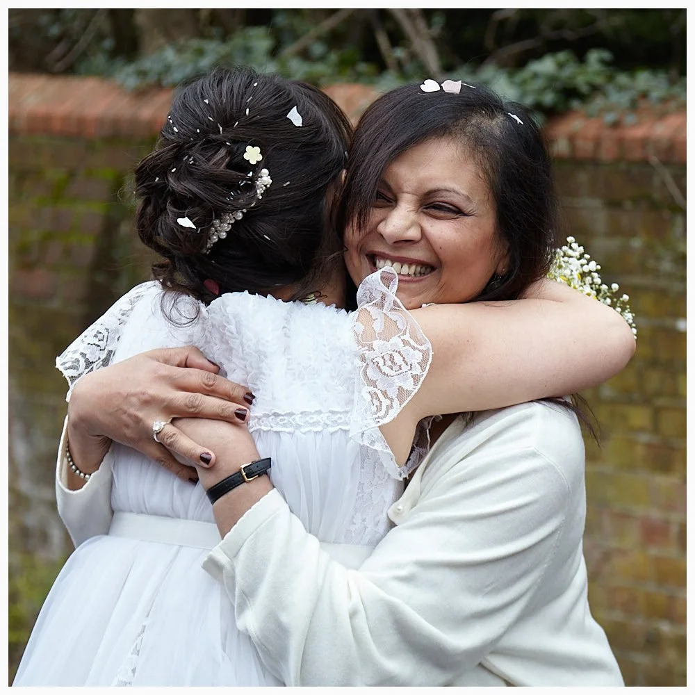 Guest congratulates the bride with a big hug after her marriage ceremony at Beaconsfield Registry Office