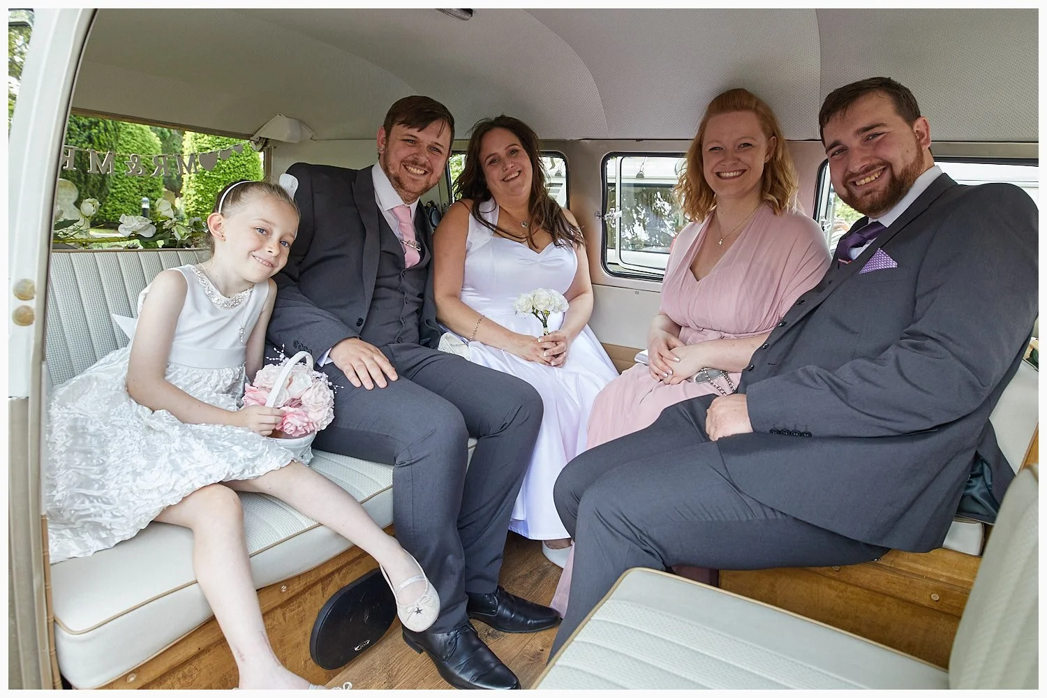 Bride and groom join some guests to travel from their ceremony location at Beaconsfield Registry Office in a lovely old Volkswagon
