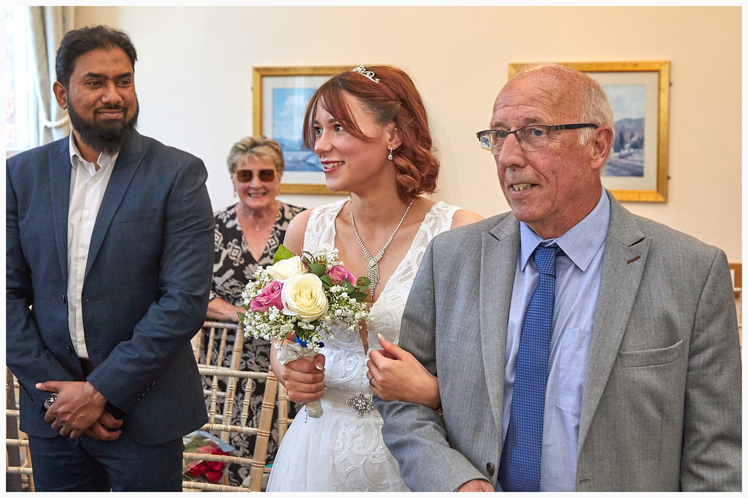 Bride and her dad enter the room at the start of the wedding ceremony